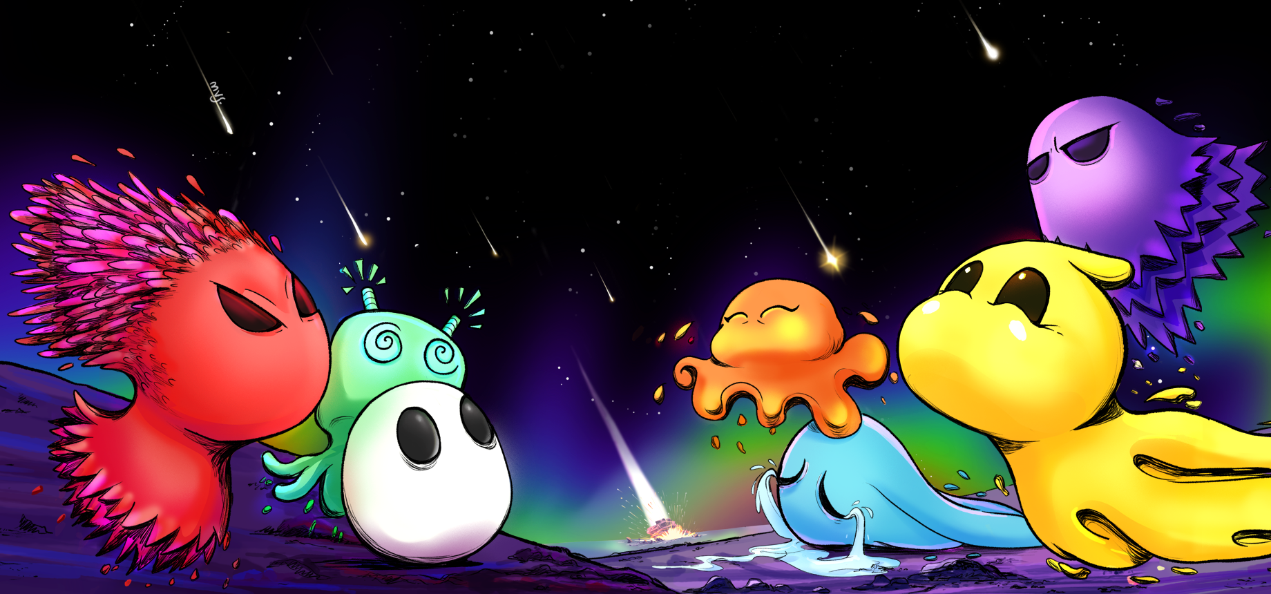 A long long time ago, colour flowed freely in the skies and grounds of Chromara. All was well for a gazillion years. But one colorful day…..strange evil monsters fell from the sky. Ravenous in their hunger, they attacked and drained all traces of hue and colour from the planet. Ambushed and desaturated, Chromara turned a lifeless grey in their wake…But deep in the heart of Chromara… there's still hope. The ancient Elixir of Colour, a prism of all life on the planet, the last beacon of hope, pulsing with the final drops of colour, is still unconquered. If it’s taken, all colour is lost forever.